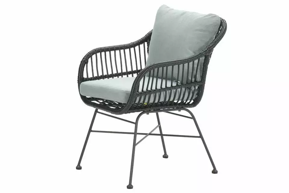 De Garden Impressions Margiet dining tuinstoel is nieuw in de collectie bij Coppens warenhuis. De tuinstoel kenmerkt zich door zijn unieke design. De stoel heeft een rotan look. Het rotan is gemaakt van kunststof wat ervoor zorgt dat de stoel een extra lange levensduur heeft. De Margriet tuinstoel heeft een stalen frame dat een powder coated behandeling heeft gehad. De kleur van de poten is antraciet en de kuip heeft een naturel kleur. De stoel wordt geleverd inclusief bijhorend zit en rugkussen in mint grey.