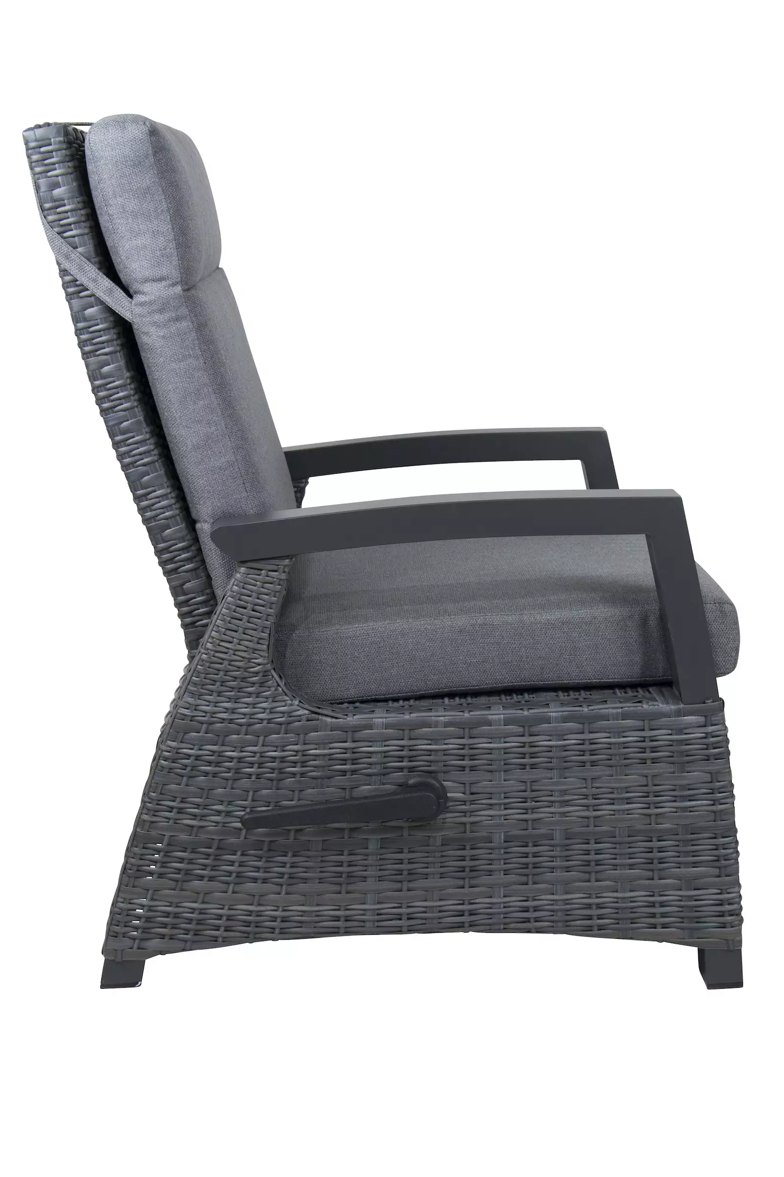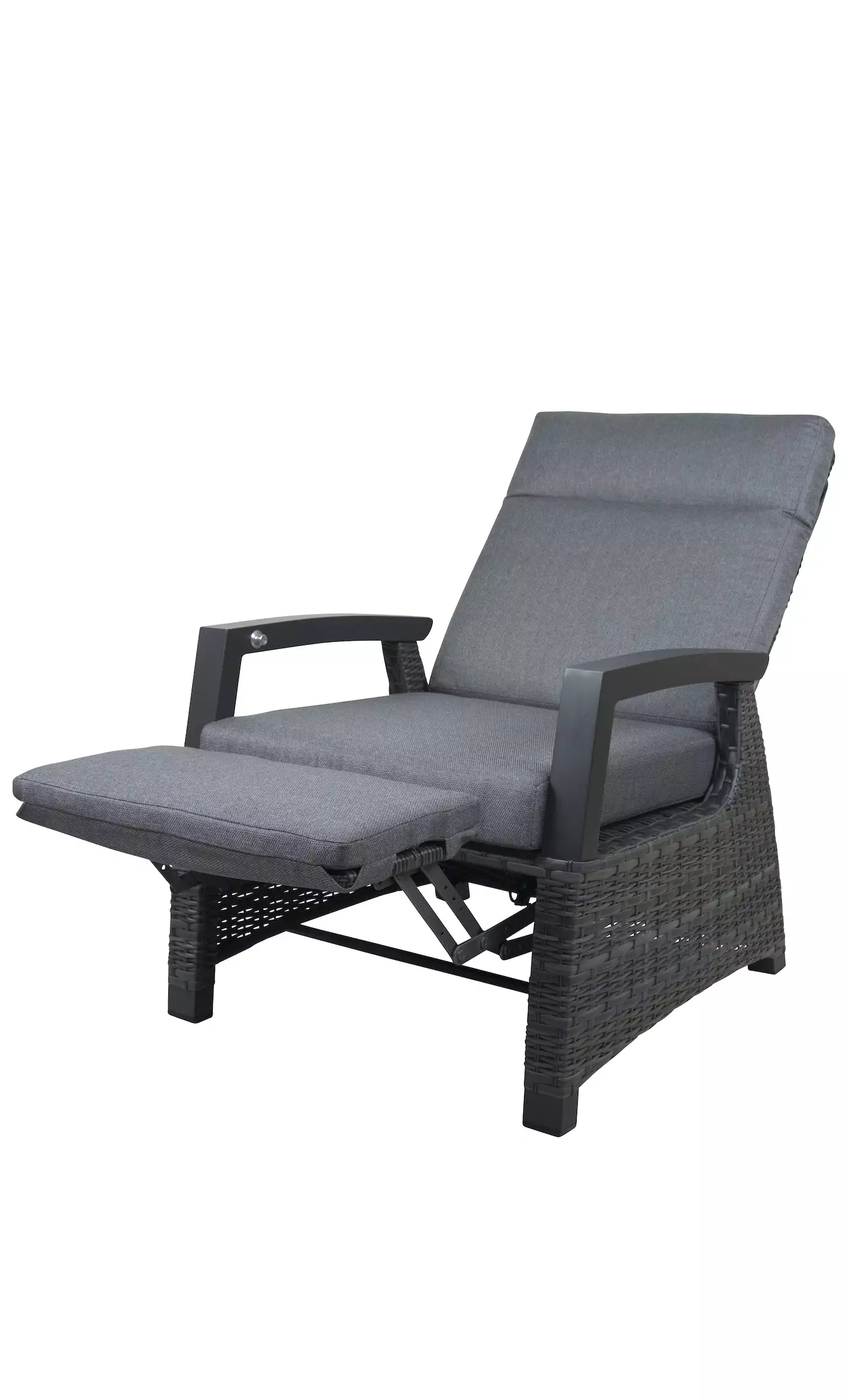 Deze loungestoel is traploos te verstellen in de rug door middel van een knop in de armleuning