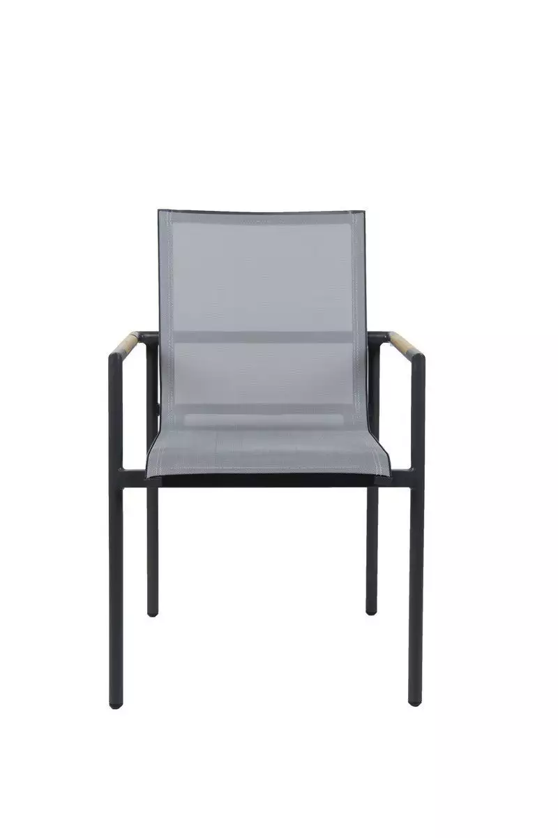 Het frame is van aluminium en is gepoederd coat in de kleur mat antraciet of terwijl royal grey. De zit en rug is van Textileen. In de armlegger is teak verwerkt. De stoelen zijn stapelbaar, je kan je gemakkelijk opbergen. Wat immers niet nodig is want de stoelen zijn zeer goed weerbestendig.