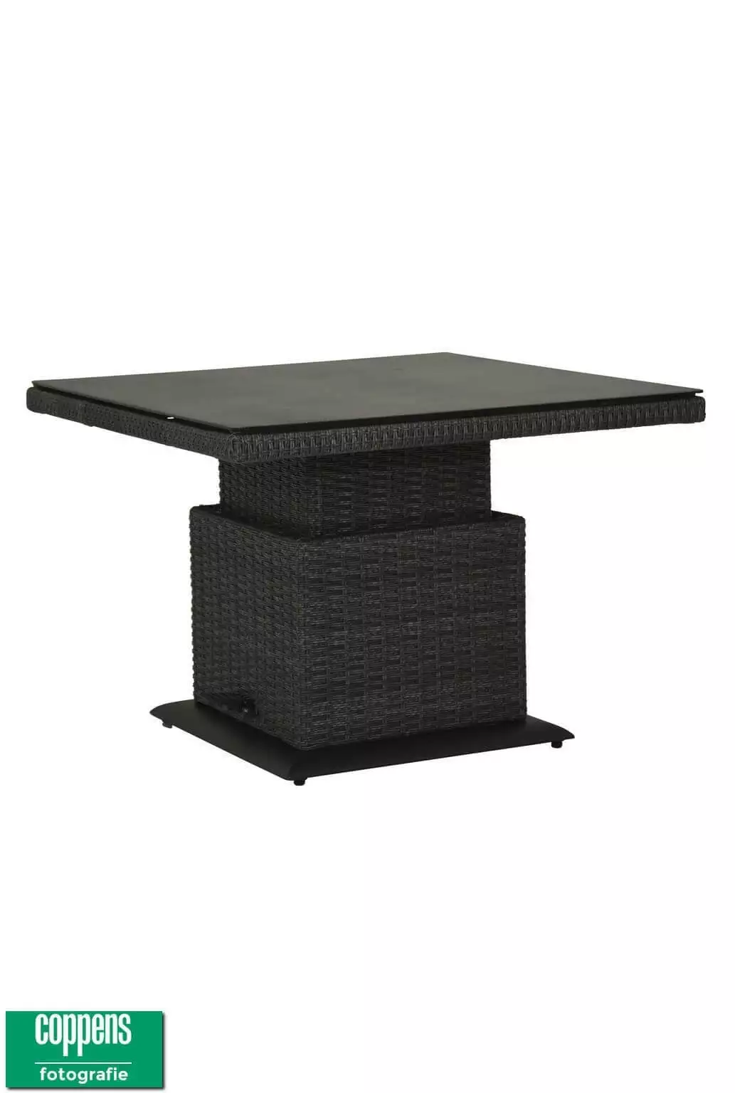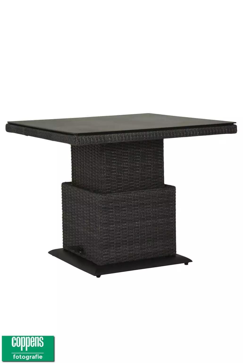 Deze tafel kan traploos versteld worden van 45 cm tot 74 cm door middel van een gasveer. Dit is ideaal om te gebruik om aan te loungen of om aan te eten. Het verstellen gaat heel gemakkelijk door een voetpedaal. Bij elke hoogte blijft de tafel stabiel staan. Het blad wat op de tafel zit is veiligheidsglas wat afgewerkt is met een spraystone toplaag. Hierdoor is het blad makkelijk schoon te maken en het is ook zeer krasbestendig. Het vlechtwerk is half rond in de kleur Antraciet.